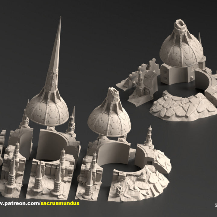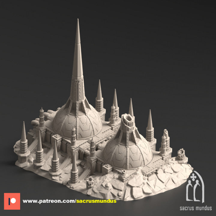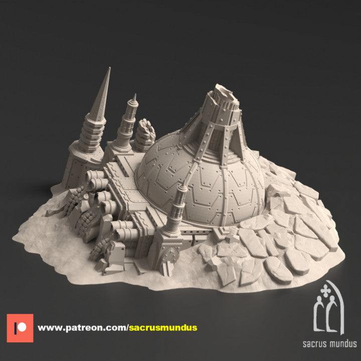 Once the proud crown of the Redeemer, these colossal spires have broken and embedded themselves into the earth like alien cathedrals. Their cracked domes, jagged steeples, and fortified buttresses loom as eerie monuments of the crash, perfect for dominating your tabletop battlefield. Use them as towering line-of-sight blockers, fortified objectives, or the haunted centerpiece of your terrain set.